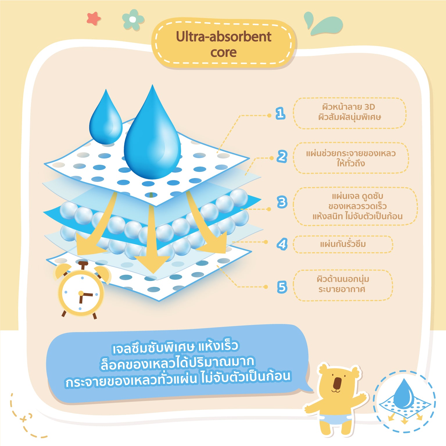Thinner, softer, more absorbent to keep baby dry and comfortable day & night (up to 12 hours of protection); ultra-absorbent core (liquid distribution layer, super absorbent gel and pulp layer for quick absorbency, leak prevention layer, soft and breathable outer layer)