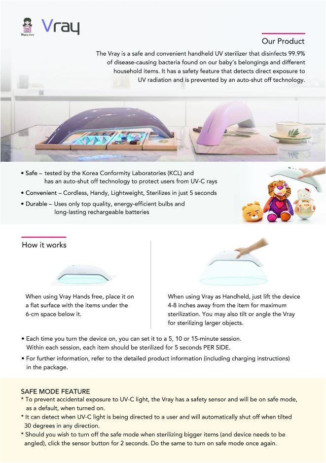 The Vray is a safe and convenient handheld UV sterilizer that disinfects 99.9% of disease-causing bacteria that can be found in our baby’s belongings or in different household and personal items. It has a safety feature that detects any direct exposure to UV radiation and is prevented by an auto-shut off technology.